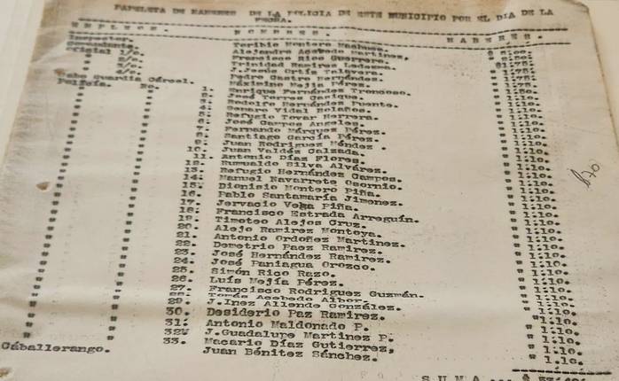 La muestra se centra en la segunda mitad del siglo XX e incluye diversos registros: salidas de presos de los años 1955 y 1956, papeletas de haberes de la policía de 1928 y 1939, así como documentos sobre el pago de alimentos a presos y heridos del Hospital Municipal.